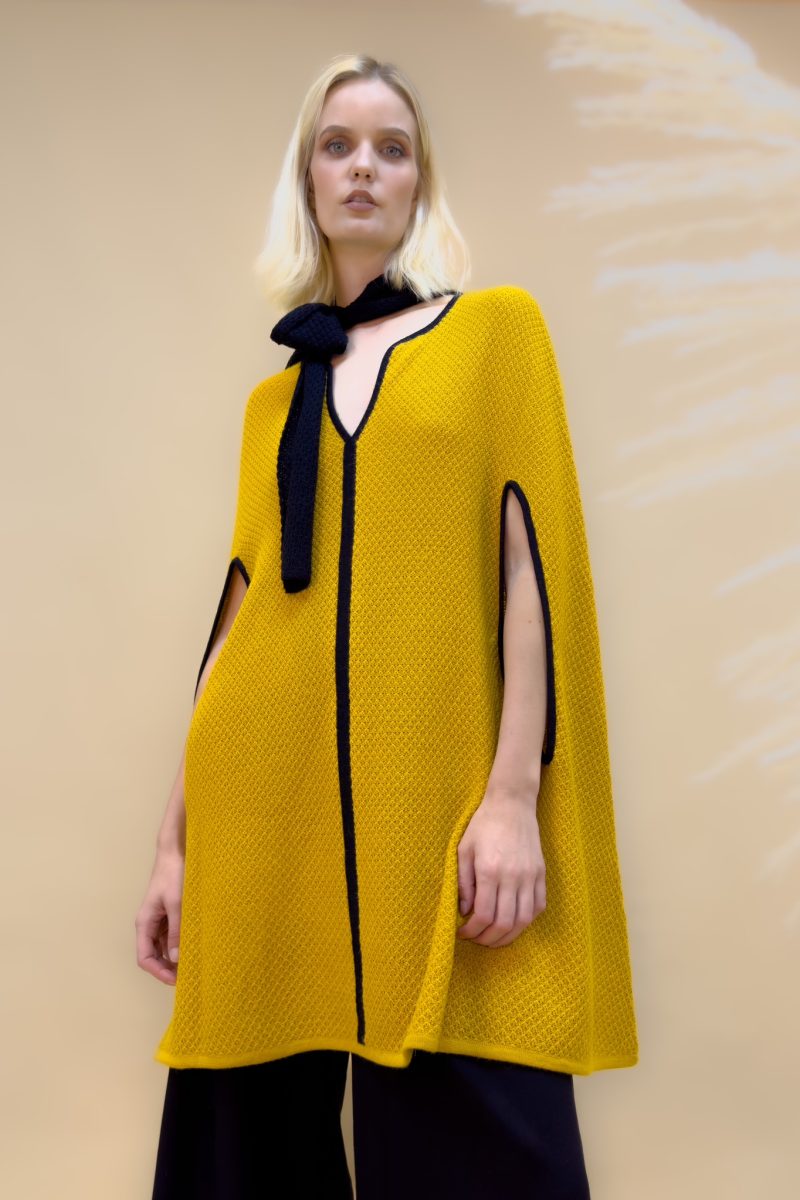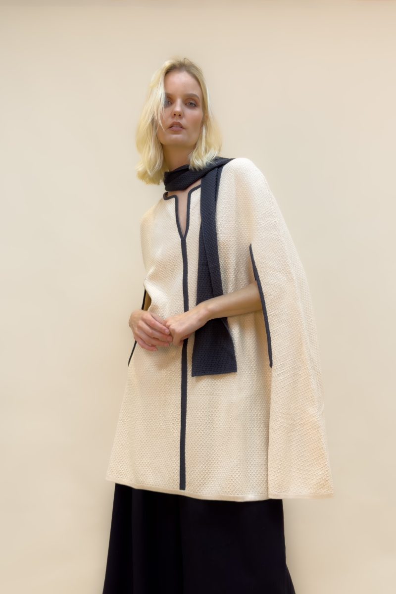 Esta capa larga cerrada es una pieza única en su estilo. Está confeccionada en 100% baby alpaca, una fibra de extrema finura, calidez y suavidad. La capa cuenta con una bufanda incorporada en el cuello, la cual se puede amarrar de diversas formas para adaptarse a tu estilo y preferencias y además líneas negras estilizan la figura.