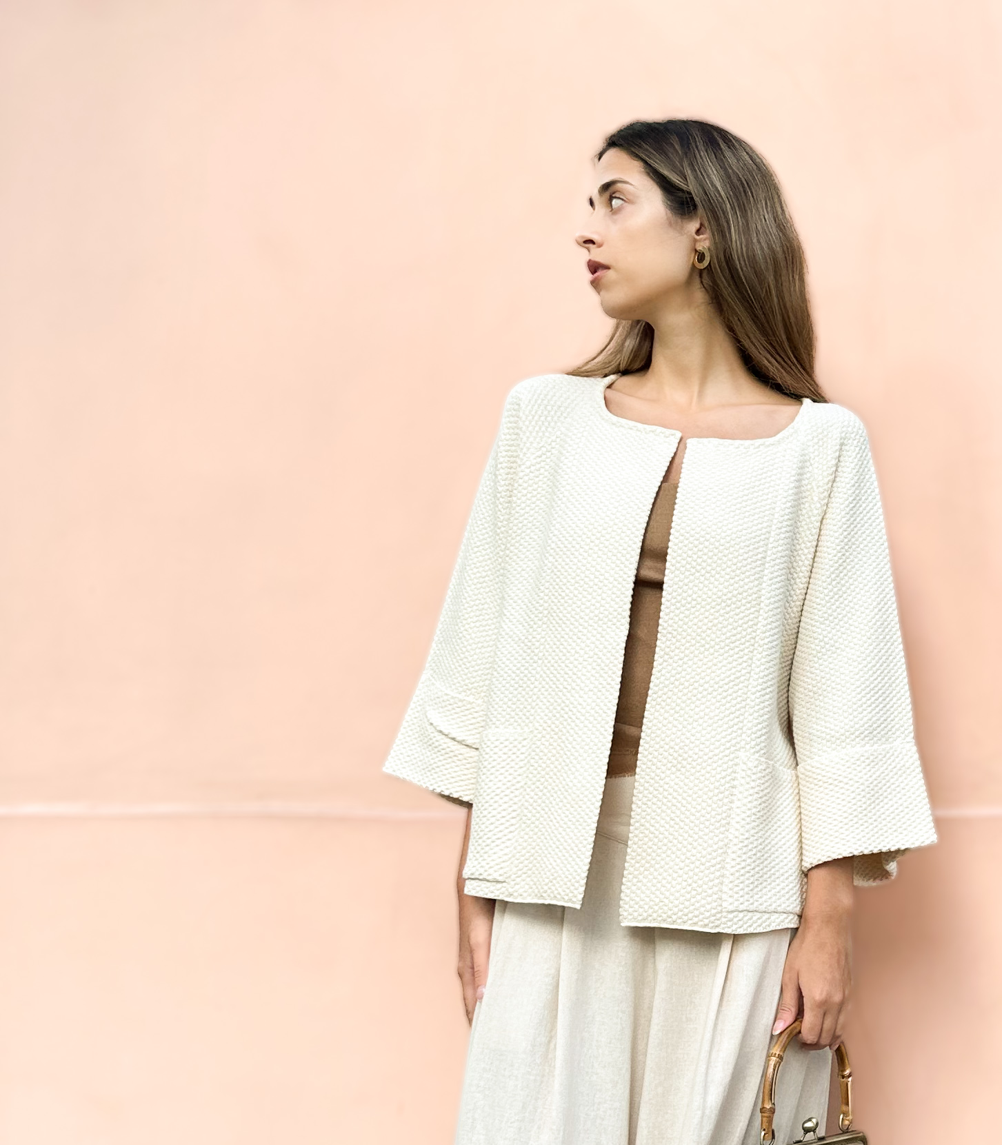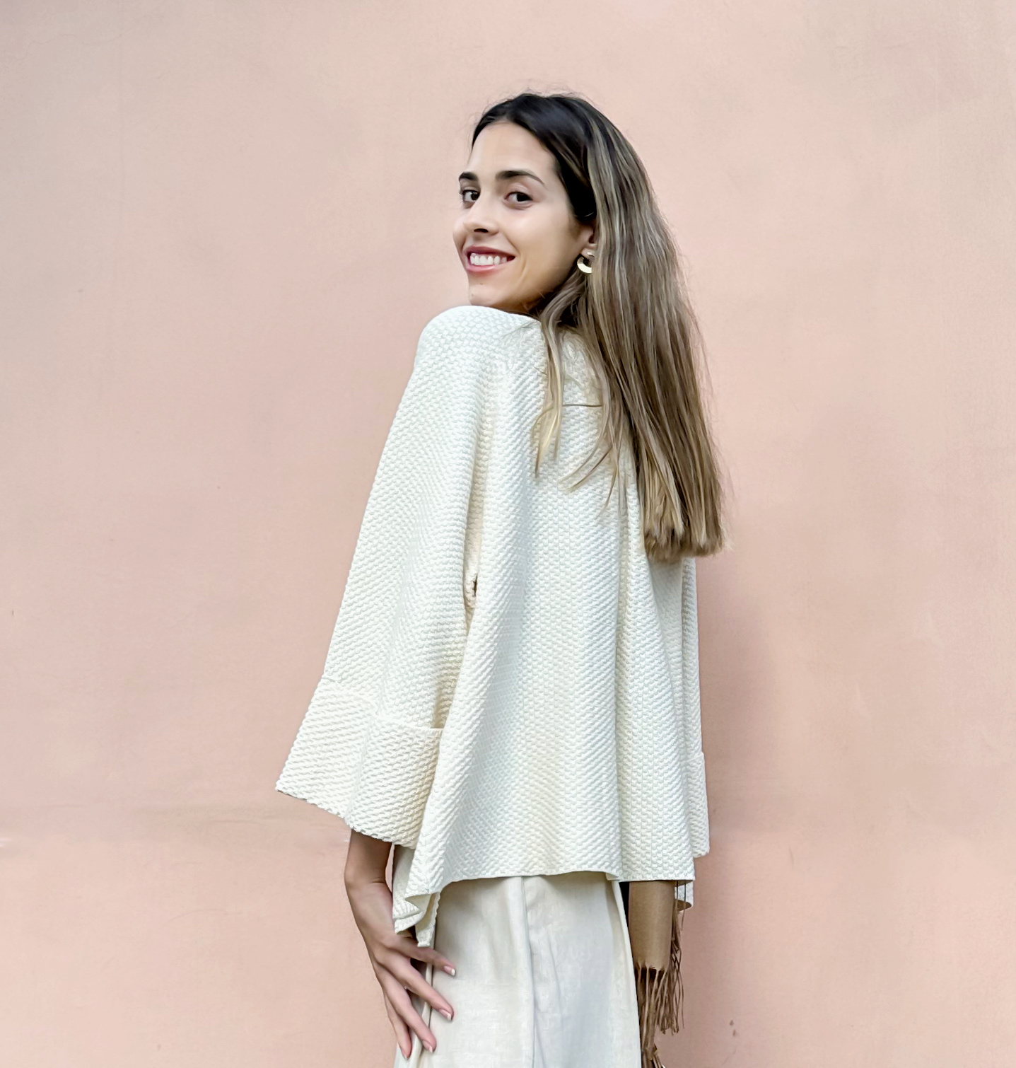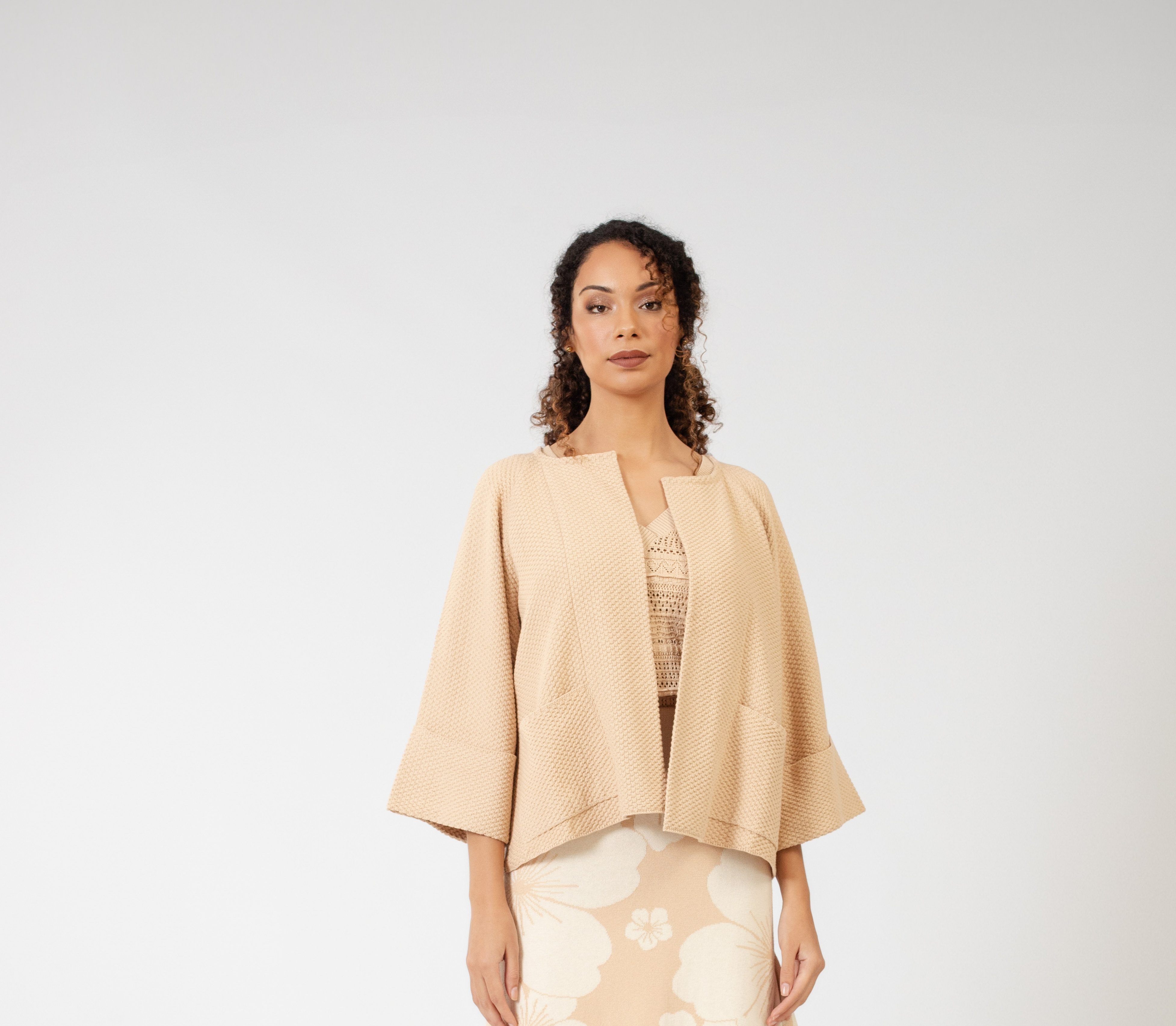 Este saco tejido corto está inspirado en un kimono y presenta un diseño minimalista que evoca elegancia y estilo. Está meticulosamente tejido en punto arroz doble utilizando la exquisita fibra de 100% Algodón Pima Orgánico, lo que asegura suavidad, calidez y finura al tacto. Además de su belleza, este saco corto práctico y versátil, ya que es combinable con cualquier tipo de atuendo.