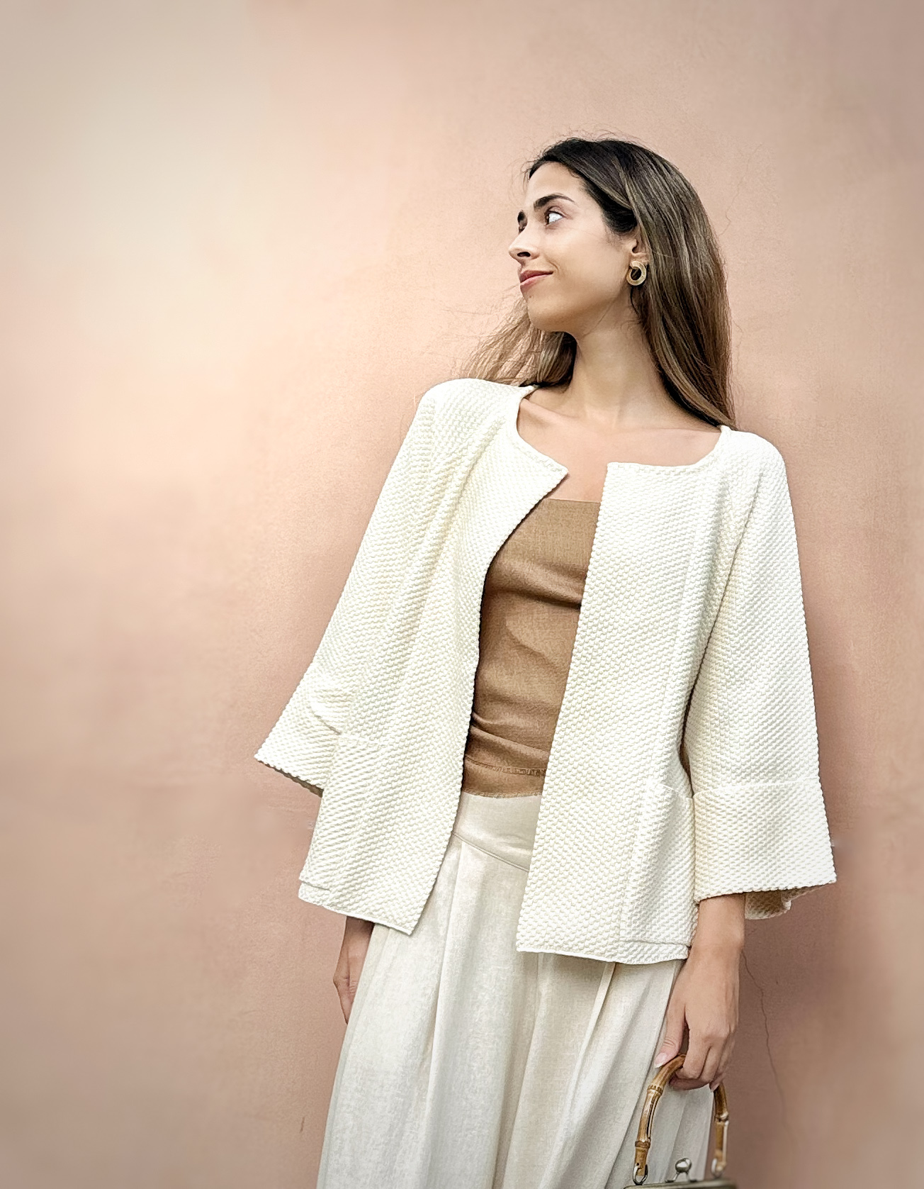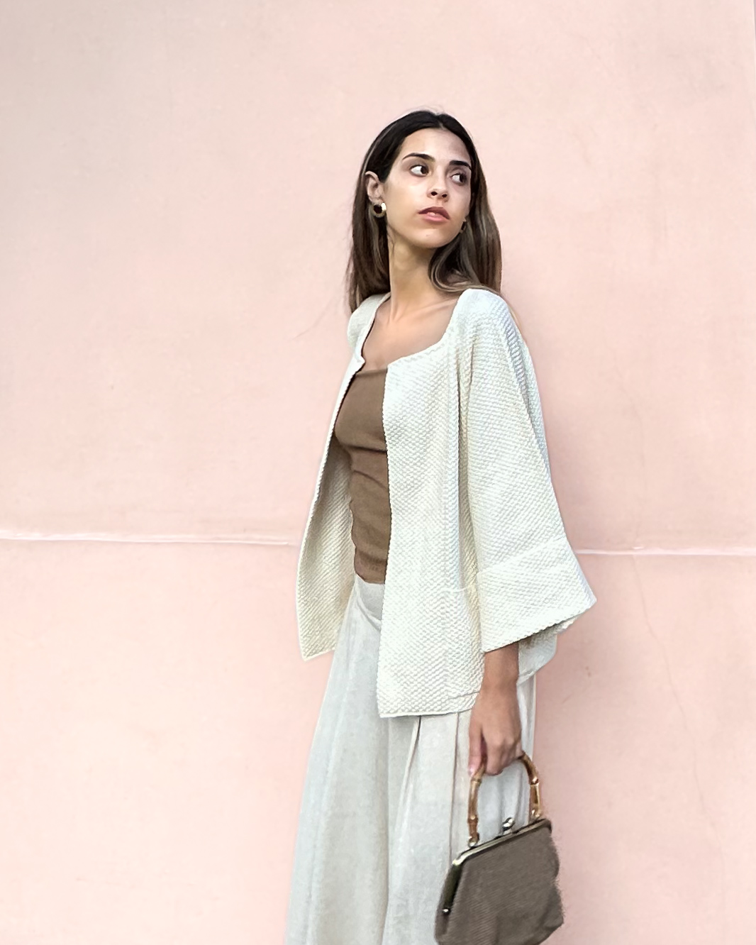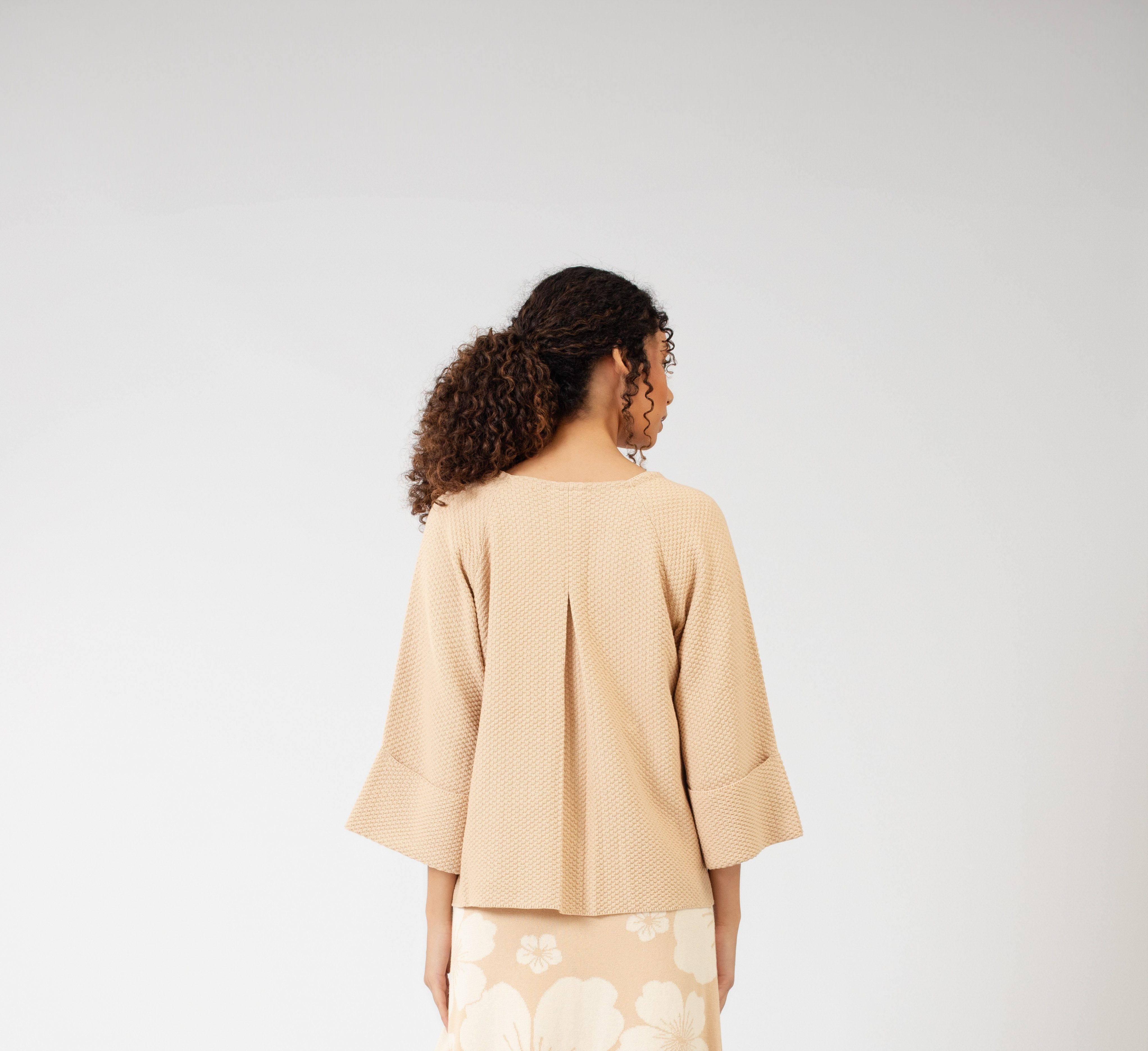 Este saco tejido corto está inspirado en un kimono y presenta un diseño minimalista que evoca elegancia y estilo. Está meticulosamente tejido en punto arroz doble utilizando la exquisita fibra de 100% Algodón Pima Orgánico, lo que asegura suavidad, calidez y finura al tacto. Además de su belleza, este saco corto práctico y versátil, ya que es combinable con cualquier tipo de atuendo.